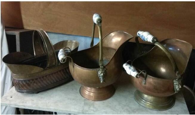 Węglarki Stare mosiężne/miedziane węglarki. Dekoracja praktyczna i stylowa zarazem. Ślady patyny, przebarwienia ...